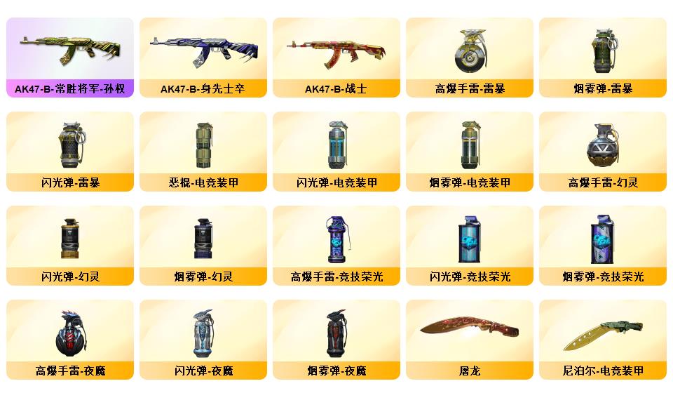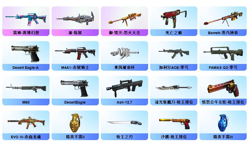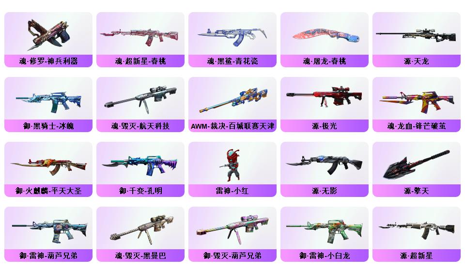 100V幻神荣光套/电竞云悠悠/惊若翩鸿/蛇隐宗/QBZ蔷薇套/毁灭音效+星空耀金青帝/极光音效/雷神星空/AG火麒麟/雷暴USP/六修罗/王者冰魄/开挂必起诉