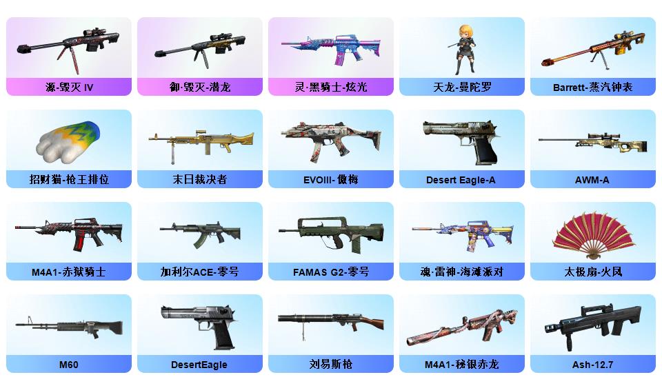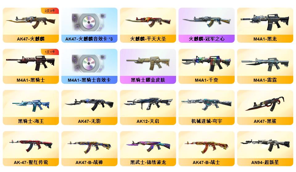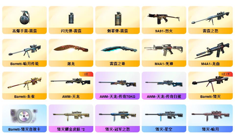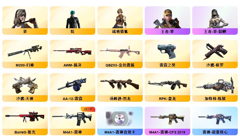 竞技荣光+QBZ+COP-雷霆*2+柯尔特-竞技荣光*3+USP雷暴*1+12套雷+音效卡(火麒麟+雷神+毁灭+黑骑士)+套装(竞技荣光套)